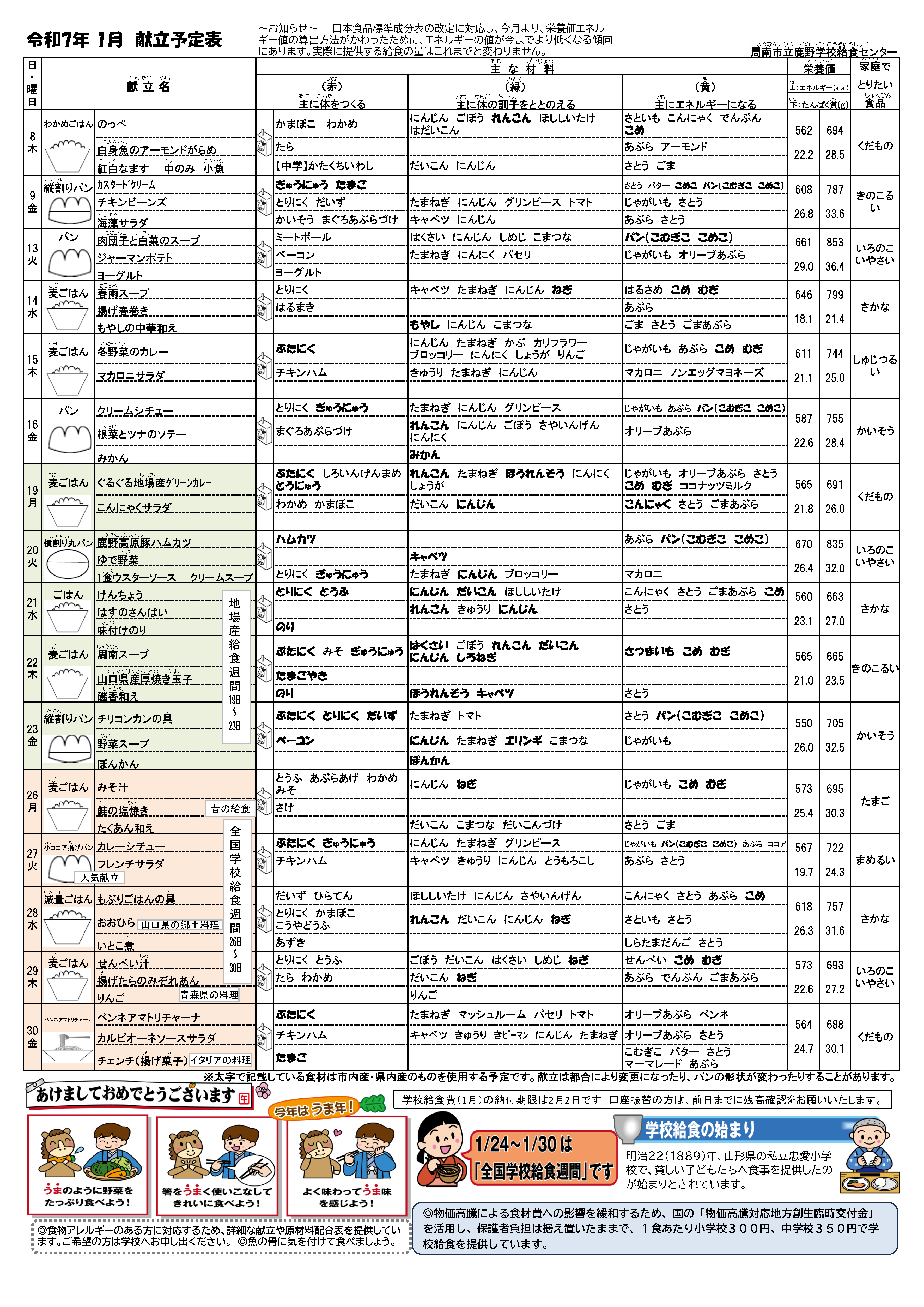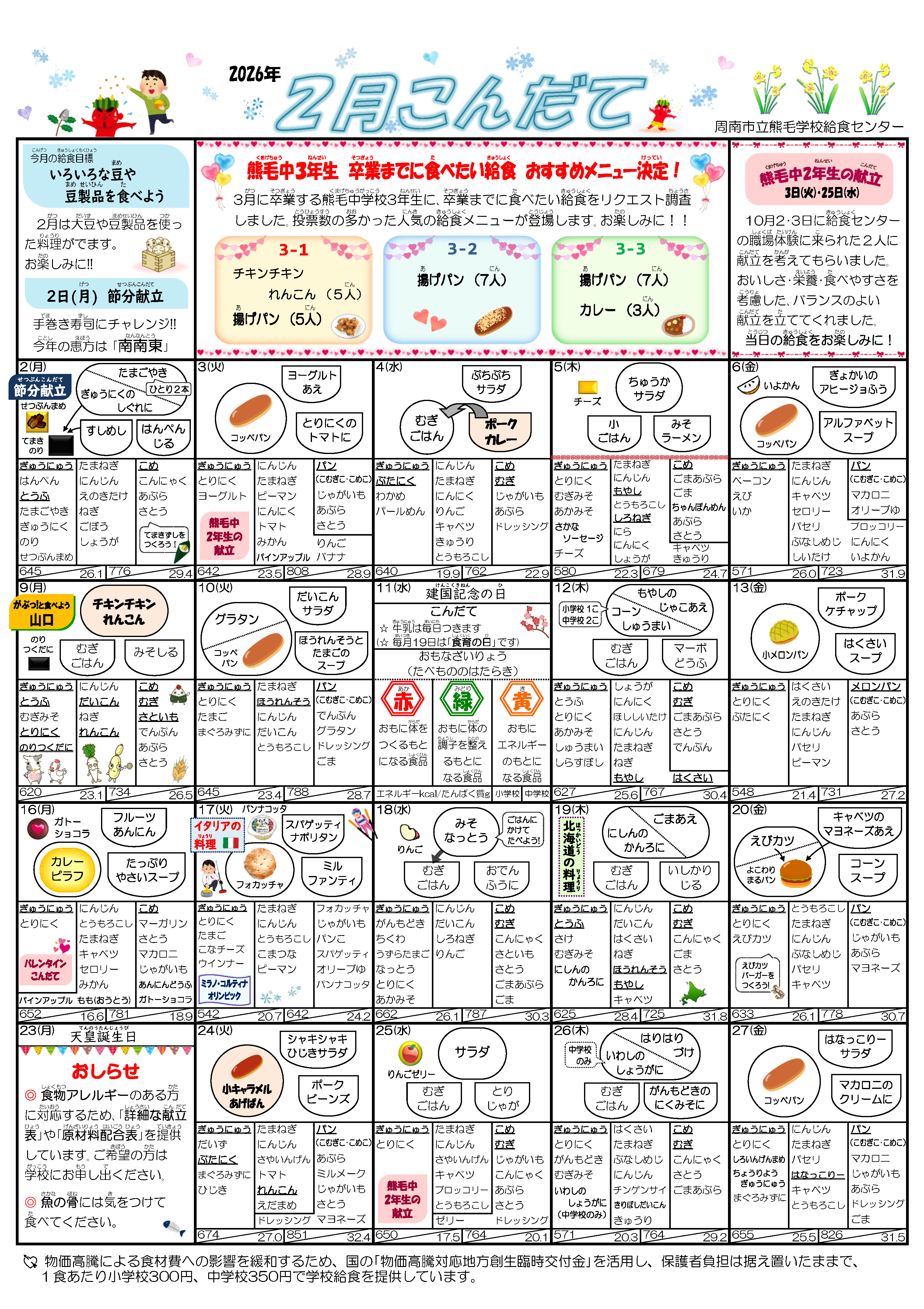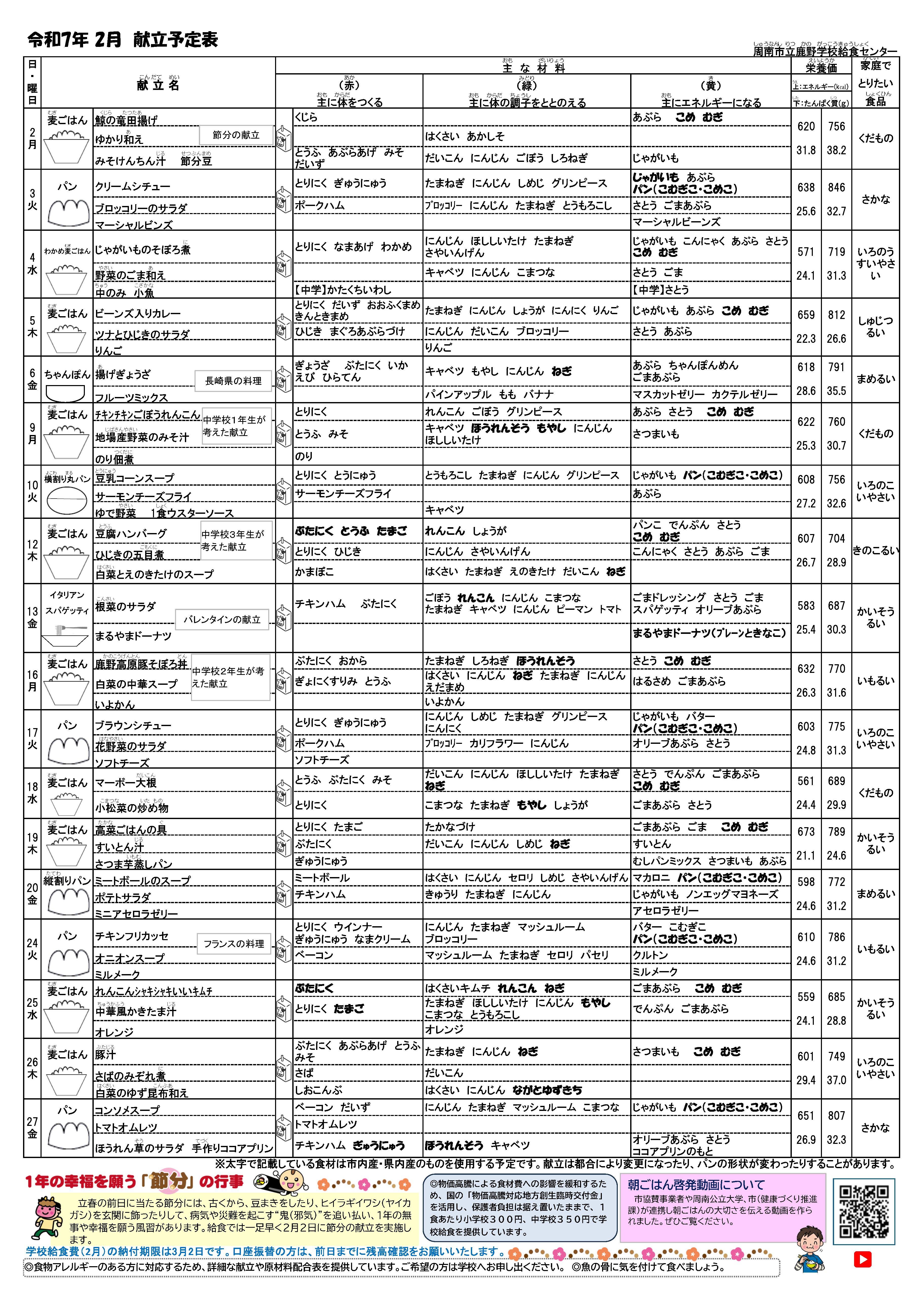 ・令和7年度の学校給食は、国の「物価高騰対応地方創生臨時交付金」を活用し、保護者負担は据え置いたままで、1食あたり小学校300円、中学校350円で学校給食を提供しています。詳しくはこちら