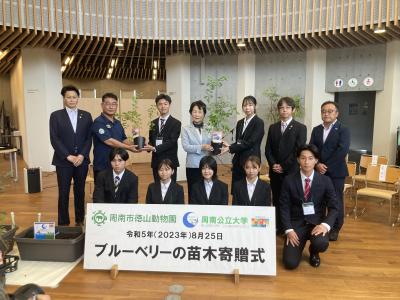 周南公立大学のブルーベリーカーボンプロジェクト実行委員会の皆さまから、徳山動物園にブルーベリーの苗木をご寄贈いただきました。学生の皆さんを始め、大学ぐるみで脱炭素に取り組まれております。誠にありがとうございます。