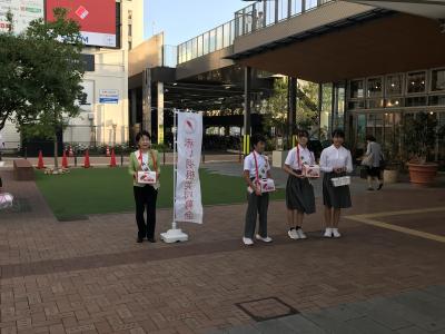 徳山駅北口駅前広場で赤い羽根共同募金運動のオープニングイベントを行いました。岐陽中学校の生徒さんもご参加いただきました。街頭募金活動にご協力をいただきました皆さまありがとうございました。