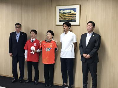 レノファ山口のホームゲームをボートレース徳山presents・周南市サンクスデーとして実施することから、ボートレーサーの佐々木完太選手、レノファ山口周南市ご当地シャレン選手の渡部博文選手が、この試合のPRのために来られました。試合は、8月28日(土)19:00からモンテディオ山形を迎えて開催されます。また、ボートレース徳山では、9月21日から26日にかけて「PG1第8回ヤングダービー」が開催されます。両方とも多くの方が来場されることを期待しております。