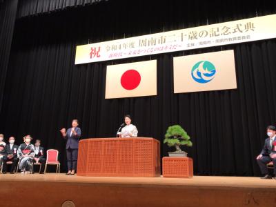 二十歳の記念式典を3年ぶりに盛大に開催することができ、出席者の皆さまには心からお祝い申し上げます。これまで温かく見守ってこられたご家族をはじめ、恩師や地域の皆さまに対し深く敬意を表します。これからの長い人生を、うれしい時もつらい時も「優しさ」を忘れずに、幸せな日々を送ってもらいたいと思います。そしていつの日も優しい、品格のある皆さんでいてください。周南市のかけがえのない皆さんの、栄えある門出をお祝い申し上げ、健康でお幸せな日々に恵まれますことを心からお祈りいたします。
