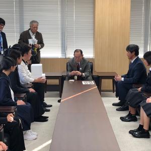 桜ケ丘高校より、平成30年9月に行った学園祭バザーの売り上げや、11月に開催されたこどもっちゃ商店街でのバザーの売り上げの一部を、平成30年7月豪雨災害に対する義援金として、市へ贈呈していただきました。