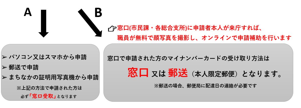 通知カード同封の「個人番号カード交付申請書」を機構へ郵送し、市役所の窓口でカードを受け取る方法です。