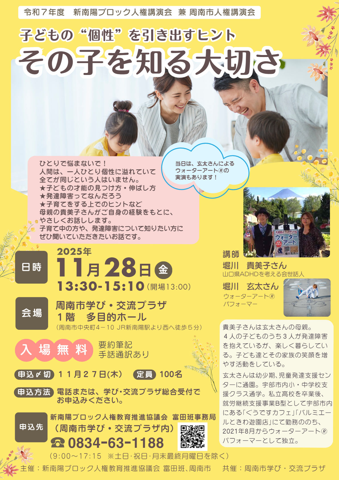 令和7年11月28日(金曜) 13時30分~15時10分 周南市学び・交流プラザ 1階多目的ホール