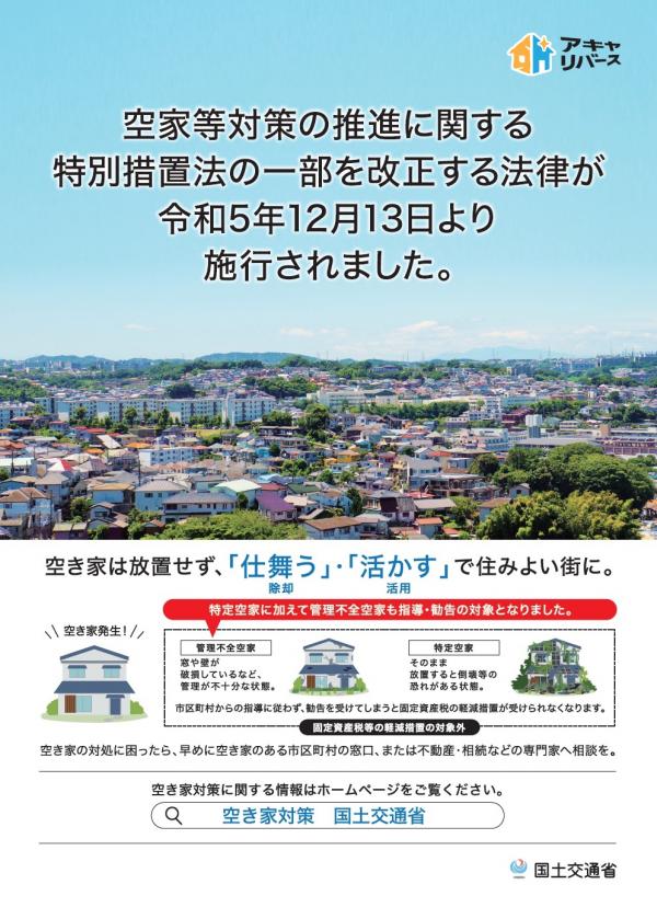 空家等対策の推進に関する特別措置法(平成27年5月26日施行)について、その一部を改正する法律が、令和5年12月13日に施行されました。