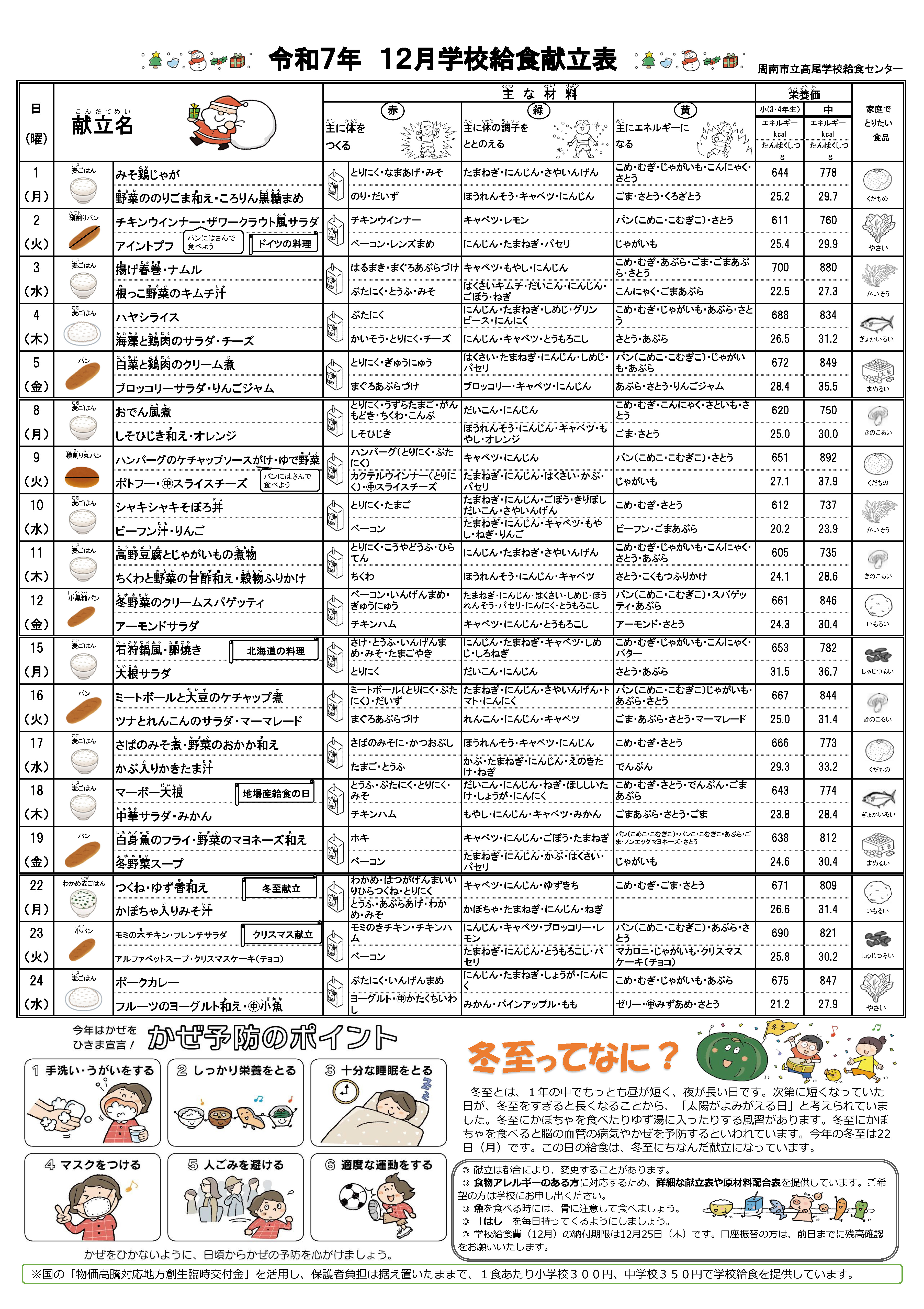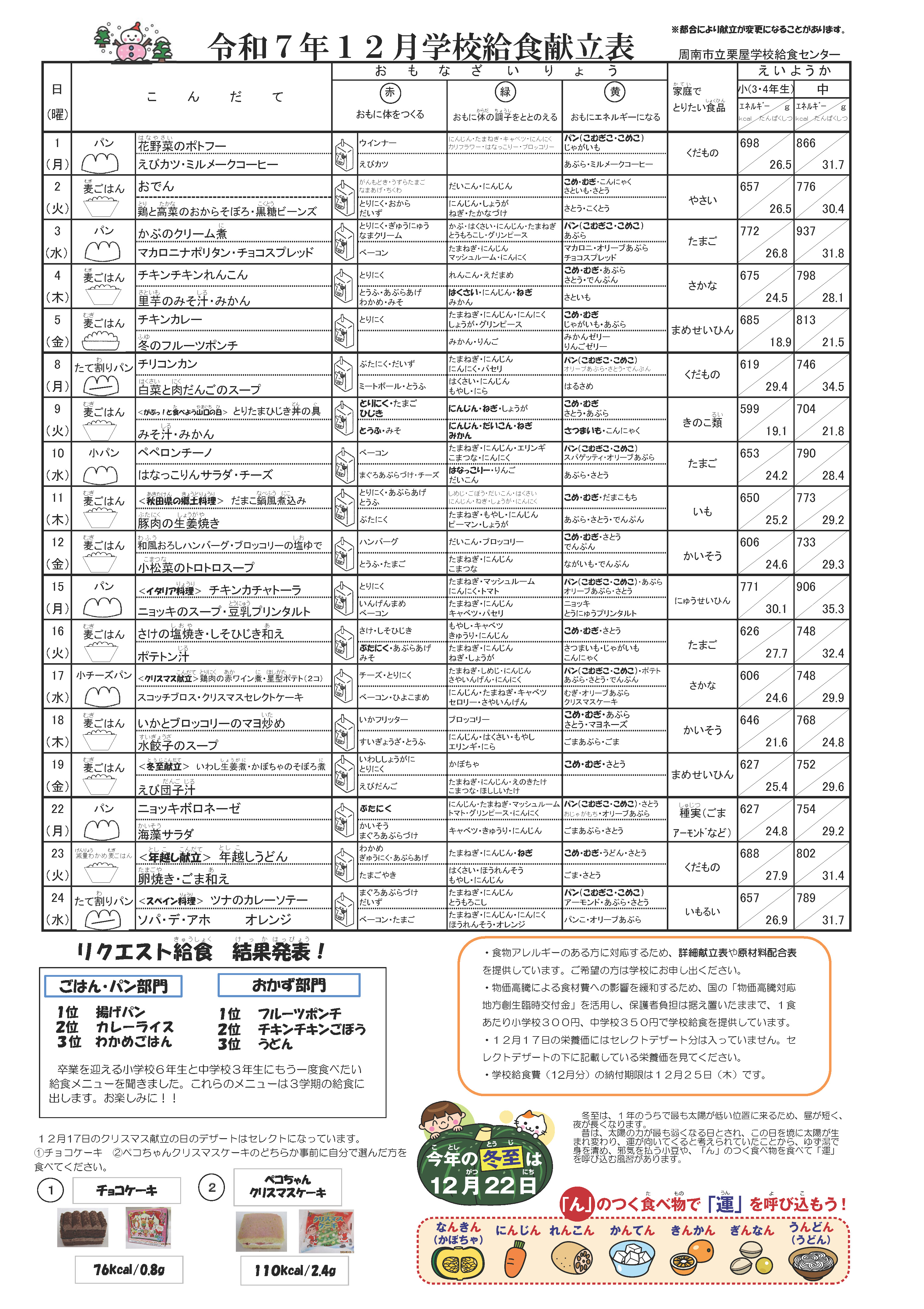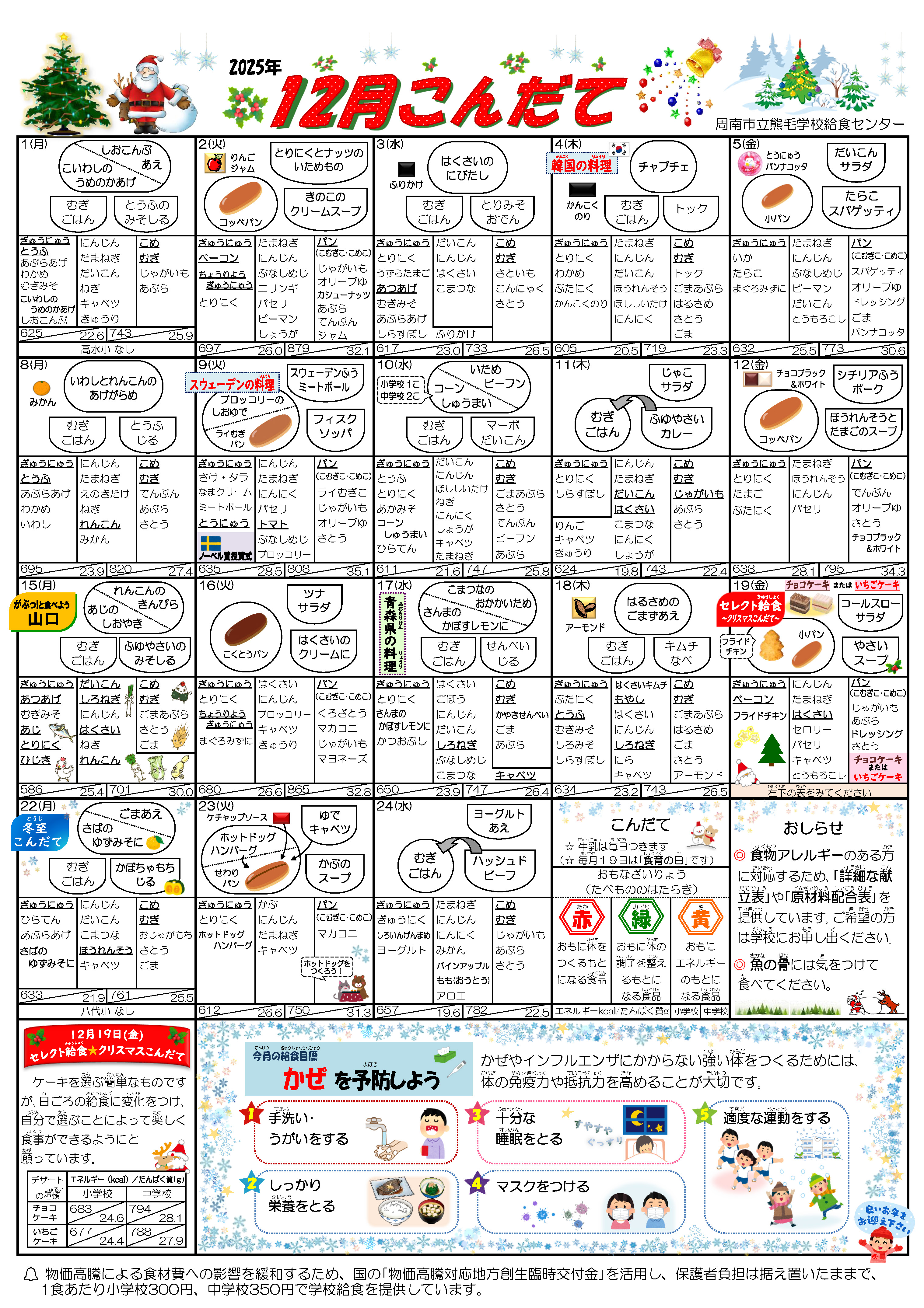 ・令和7年度の学校給食は、国の「物価高騰対応地方創生臨時交付金」を活用し、保護者負担は据え置いたままで、1食あたり小学校300円、中学校350円で学校給食を提供しています。詳しくはこちら